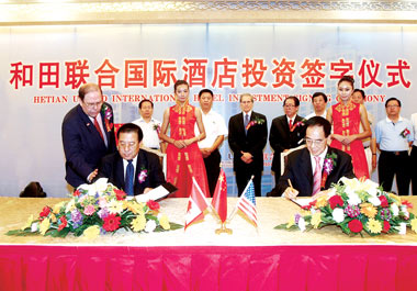 和田集團是我市發展迅速的一家本土企業,短短8年里,和田集團由單一的成品油銷售拓展為集物資貿易、投資管理、房地產開發、酒店經營、高科技開發為一體的多元化企業。 數年間,營業總額過百億元、上繳國家稅金累計1億多元。和田大廈是和田在晉中開發區中的在建項目,現已告竣,為了提高該項目的效益,拓展和田集團的發展空間,和田通過招商引資,決定與聯合國際酒店投資集團共同投資,將和田大廈擴建成標準化國際五星級酒店,并建設高檔寫字樓、專家樓和高級公寓。據了解,和田聯合國際酒店及配建項目總投資5億元,總建筑面積13.5萬平方米,集住宿、餐飲、會議、健身、娛樂為一體。酒店一期工程已由和田集團投資1.3億元完成了主體工程的建設,第二期的裝飾工程將由合作雙方投資2億元共同實施。