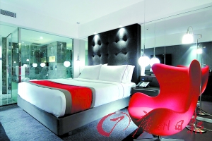 走在酒店中,大堂、餐廳、走廊,總能發現一絲紫色在眼前閃過,訴說著酒店帶有神秘感的紫色主調,但進入房間后又會擁有另一種私人主題色彩。酒店大部分客房都會有一張Egg Chair,這張丹麥設計大師Arne Jacobsen設計的經典Egg Chair將房間的摩登風格發揮得淋漓盡致,紅、綠、紫以及灰藍,不同色彩的Egg Chair就是Mira房間色彩的標志。而配合著Egg Chair色彩設計的臥室以黑、白相間,簡單不失高雅。