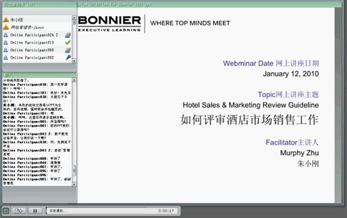 本次網絡研討會采用最新的網絡實時交流技術,參會者通過一臺接入網絡的計算機,進入邦尼酒店精英俱樂部的活動網址,就可傾聽演講人的報告,觀看演講人的PPT文檔,同時還可以與主講人以及其他參會者進行實時在線溝通。