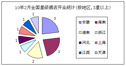 從開業(yè)酒店的地域分布來(lái)看,本月開業(yè)星級(jí)酒店分布相對(duì)比較集中,安徽和海南開業(yè)酒店數(shù)位居榜首,達(dá)3家,湖南位列第二,開業(yè)2家,浙江、上海、天津、河北和江西分別開業(yè)1家。對(duì)比09年第4季度和2010年1月份數(shù)據(jù),一直位居前列的浙江、上海等地區(qū)本月開業(yè)酒店數(shù)并不多,而安徽、湖南和海南地區(qū)近幾個(gè)月酒店開業(yè)相對(duì)比較活躍。