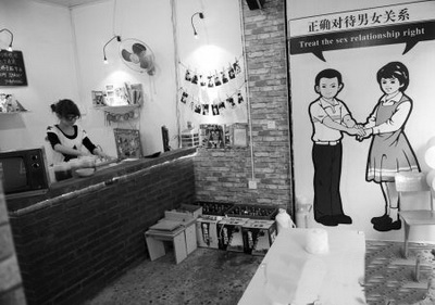 店面右側(cè)的一扇門上,貼著李雷和韓梅梅手拉手的照片,“正確對待男女關(guān)系”的中英文旁白讓人忍俊不禁。