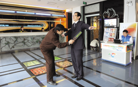 隨著世博會開幕式臨近,上?伤闶侨墙鋫洌B賓館保安都要配備安檢器。