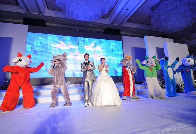 當天,凡現場成功預訂宴席的,在婚禮當天可免費使用貢多拉“愛之船”一次,免費使用酒店“愛之亭”一次,贈送便攜式“心心相映”手模一個,凡成功預訂婚宴25圍以上即送一圍。