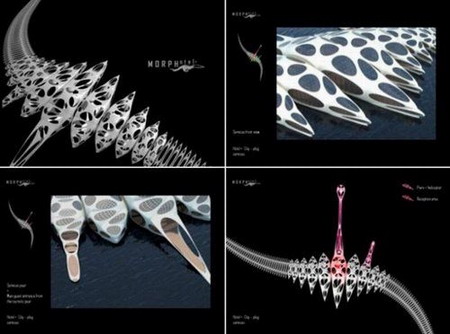 Morphotel酒店大致分為幾個區域,黃色區域是旅館的主要部分及公共區域,深藍色區域則是由能讓酒店脊椎變形的功能模塊結構組成,淺藍色的三角形區域是標準客房,灰色三角形區域則是要預定的豪華頂級客房。