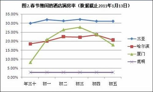 《2011年1月份酒店預訂價格指數報告》(下稱《報告》)顯示,目前三亞、昆明等熱門旅游城市春節期間的酒店滿房率已超過30%,即春節期間的酒店客房已有30%被預訂,春節旅游預訂高峰期已經到來。