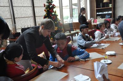 當日,在酒店的西餐廳云鵑閣,餐廳經理 -- 來自保加利亞的瑪格瑞特“老師”與小朋友們分享了西式的餐桌禮儀,教大家如何折疊特別的圣誕樹口布,教大家如何正確地使用刀叉,讓大家了解在用餐的時候需要注意的禮節,如:不要站起來拿離自己太遠的食物;咬東西需要閉上嘴巴,避免發出聲音;對食物以及為自己提供食物的人要懷有一顆感恩的心。最后,瑪格瑞特“老師”還給大家講了世界各地奇特的用餐禮節,就比如在葡萄牙,當你餐桌上沒有提供鹽和胡椒,那最好不要問服務員拿,因為這表示你不太滿意這道菜,是對廚師的不尊重。