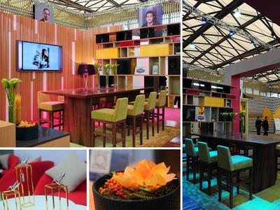 在希爾頓歡朋的酒店大堂設計原則里面,“HUB(體驗中心)”是一個很重要的元素。前臺、歡迎區(qū)、休閑區(qū)、聚會區(qū)、商務區(qū)都是圍繞著 HUB 來進行設置,這次在展會現(xiàn)場,歡朋就采用了酒吧臺的概念來設置展位的接待臺,并在現(xiàn)場呈現(xiàn)了聚會區(qū)的設計,通過厚實的高桌、舒適安穩(wěn)的高腳座椅以及充滿現(xiàn)代感的書架,營造出一個舒適的、親朋歡聚的區(qū)域。