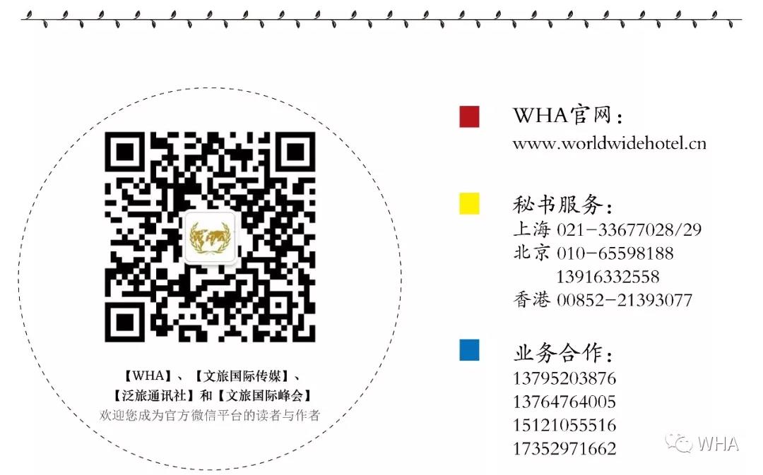 【W(wǎng)HA】、【泛旅通訊社】、【文旅國際傳媒】、【文旅國際峰會】: 國際視野、行業(yè)聲音、價值發(fā)布 WHA是世界酒店聯(lián)盟的簡稱。世界酒店聯(lián)盟和泛旅文化集團是旅游和酒店業(yè)頗具影響力的文化、資訊、傳媒、論壇(峰會)、獎項評選、品牌連鎖加盟、投資管理、供應(yīng)商產(chǎn)業(yè)鏈合作的綜合服務(wù)平臺。泛旅通訊社、文旅國際傳媒、以及文旅國際峰會作為WHA合作聯(lián)動的官方微信平臺,分享具有時效性和前瞻性的旅游和酒店業(yè)行業(yè)資訊。 歡迎您成為【W(wǎng)HA】、【泛旅通訊社】【文旅國際傳媒】和【文旅國際峰會】官方微信平臺的讀者與作者,及時獲取旅游和酒店行業(yè)諸多有價值的信息。 |